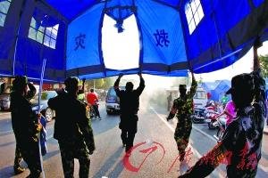在盈江县盈湖公园广场附近,云南德宏州陇川县的民兵为灾民搭帐篷。记者庄小龙摄