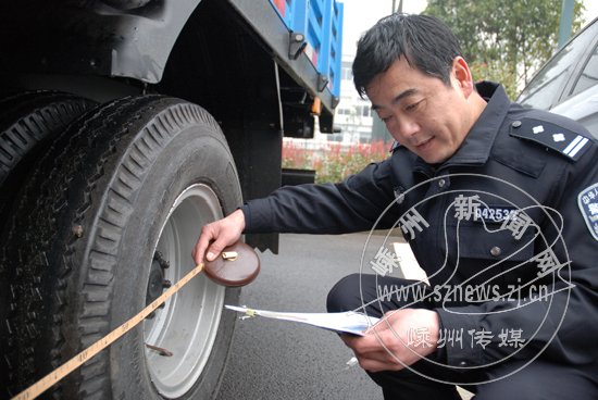 天下着细雨,但为了车辆放心上路,车管所的交警认真测量着车辆