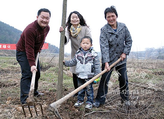 这一家子的男主人名叫袁林,是三界镇陆康小学的教师。上星期,他从报纸上获悉“爱心公社林”植树活动后,就打电话来报名参加。同是老师的妻子对此非常支持,两人决定带着儿子一块来参加爱心植树活动。
