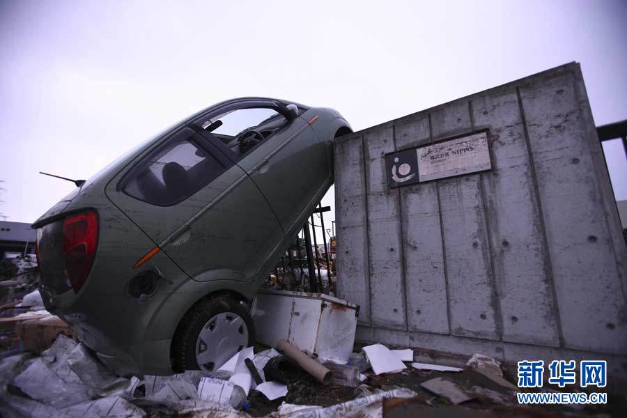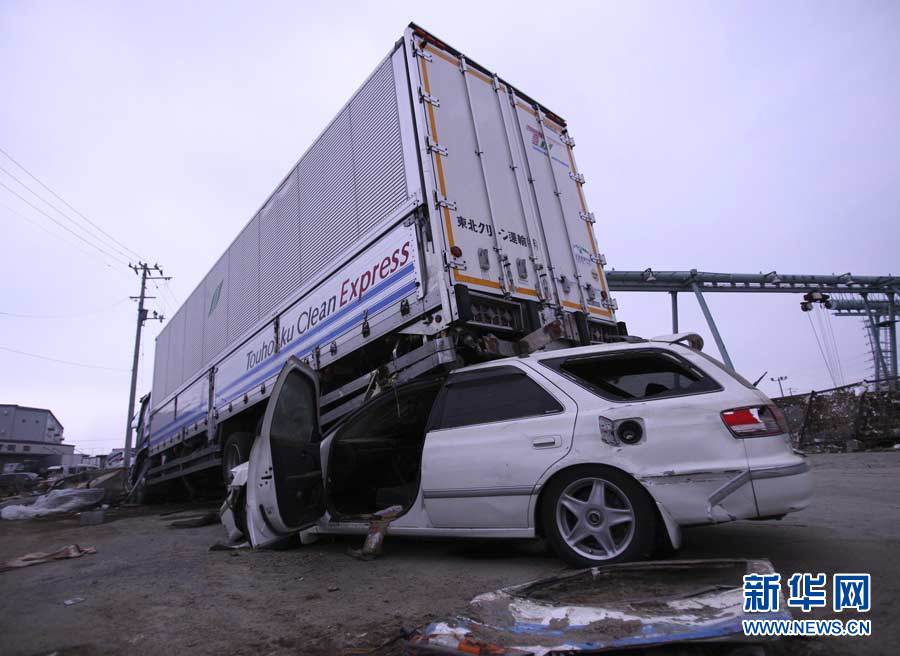 3月15日,在日本地震重灾区宫城县仙台港附近,一辆汽车被地震引发的海啸损毁。当地到处可见大量损毁的汽车,静静地述说着地震海啸的惊人破坏力。 新华社记者陈建力摄