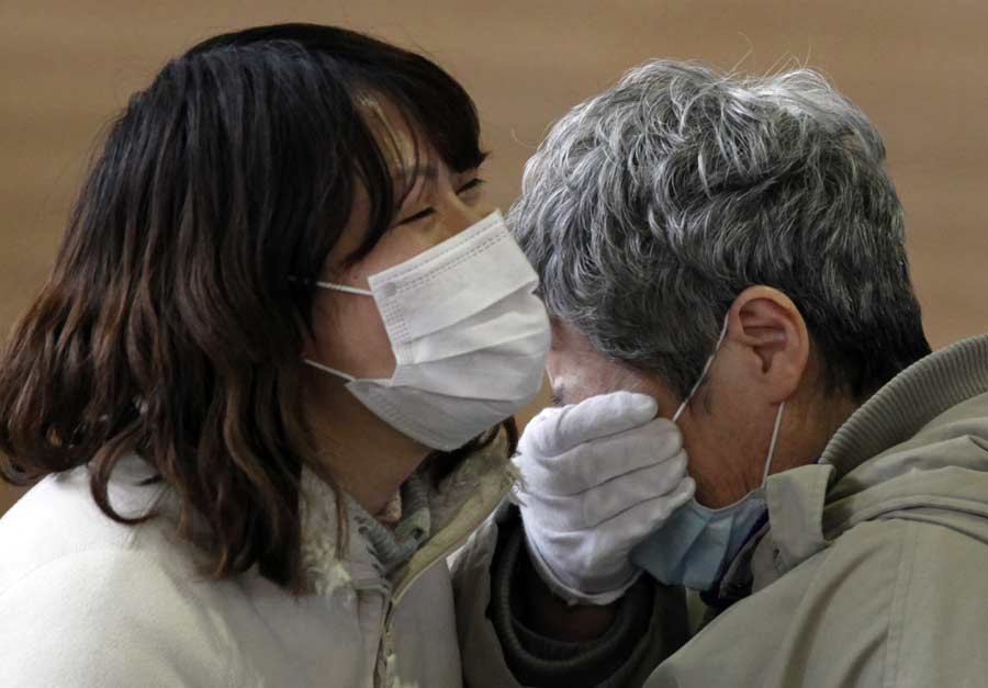 3月15日,在日本岩手县的一个临时避难所内,一名妇女与亲人团聚后哭泣。据日本共同社15日报道,日本警察厅宣布,截至15日8时,日本东北部海域11日发生的强震及其引发的海啸已确认造成2414人死亡,3118人失踪。新华社/路透