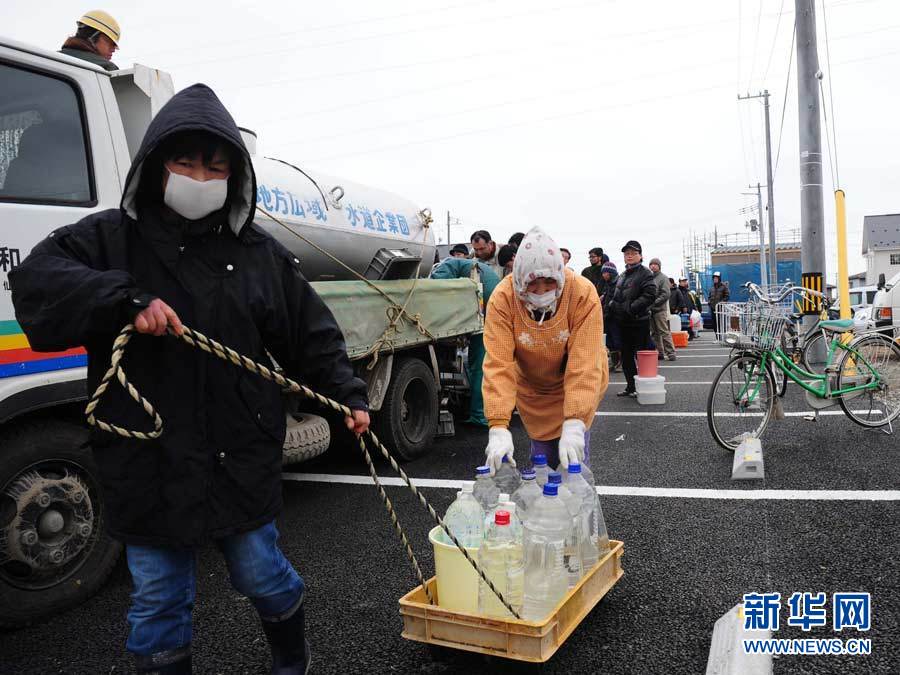 新华社照片,宫城(日本),2011年3月15日 日本震区生活用水紧缺 3月15日,在日本宫城县石卷市街头,两名老人领取生活用水后离开。缺水给震区居民的生活和生命带来很大的威胁。虽然有生活用水从外地紧急运往灾区并按人头分配,但还远远不能满足灾民需求。 新华社记者 季春鹏摄