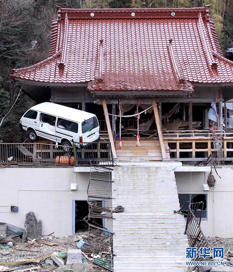 3月15日,在日本岩手县陆前高田市,一辆汽车冲进乡村道路旁的一座日本寺庙里。日本大地震发生后,灾区被海啸冲击的痕迹处处可见,一些城市交通仍处于瘫痪状态中。 新华社记者 陈建力 摄