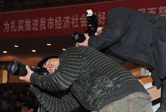 “两会”期间,记者们全身心地投入采访之中。为了将市政协十三届五次会议开幕式的盛况拍摄得更清晰、更完美,市新闻传媒中心的记者正在变换角度拍摄。