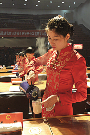 市十四届人大五次会议开幕式召开在即,虚席以待的5排主席台座位上,出现了5位身穿红色礼服的姑娘。她们个个脸上漾着笑,端着水壶,一一将座位上的空水杯注入热茶。因为训练有素,姑娘们的动作整齐划一,就如同一条美丽的直线,妆点着会场。