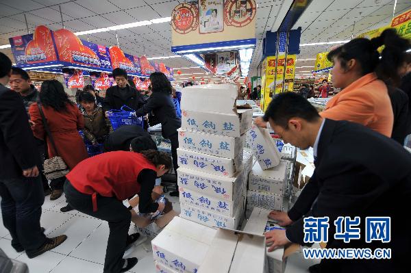 3月17日,在济南银座超市玉函路店,工作人员在协助顾客购买食盐。当日,中国盐业总公司发布声明称,已向各地下属盐业公司下发紧急通知,要求各地盐业公司立即启动应急工作机制,加强生产组织和销区市场管理,确保食盐供给。中盐总公司还表示,目前食盐储备十分充足,完全能够满足群众需求,请消费者不要相信谣传,不要盲目抢购囤积。据了解,受日本地震引发的核电站事故影响,网络上出现了海水受到污染,今后生产的海盐不安全、不能食用等传言;同时还有传言称含碘物品可预防核辐射、食盐要涨价,造成部分地区民众盲目抢购囤积碘盐。新华社记者朱峥摄