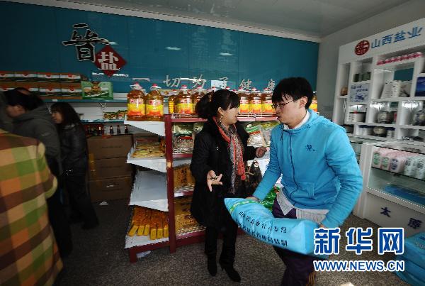 3月17日,山西省盐业公司太原分公司的员工在搬运食盐,供市民购买。当日,中国盐业总公司发布声明称,已向各地下属盐业公司下发紧急通知,要求各地盐业公司立即启动应急工作机制,加强生产组织和销区市场管理,确保食盐供给。中盐总公司还表示,目前食盐储备十分充足,完全能够满足群众需求,请消费者不要相信谣传,不要盲目抢购囤积。据了解,受日本地震引发的核电站事故影响,网络上出现了海水受到污染,今后生产的海盐不安全、不能食用等传言;同时还有传言称含碘物品可预防核辐射、食盐要涨价,造成部分地区民众盲目抢购囤积碘盐。新华社记者 燕雁 摄