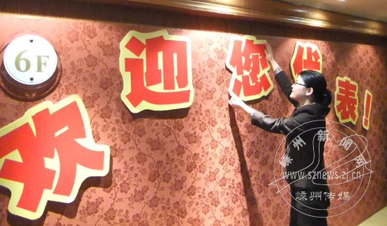 嵊州宾馆6楼的人大代表团小组活动地点,工作人员精心张贴“欢迎您代表”字样