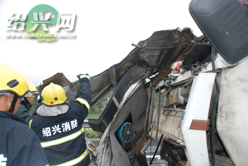 事故发生后,当地高速交警、消防和医务人员相继赶到现场救援。到场后,消防队员发现一辆车牌为豫P.Z02ⅹⅹ集装箱货车停在紧急行车道上,车上一男一女均未受伤;车牌为浙B.605ⅹⅹ集装箱货车紧随其后,车头顶在河南集装箱货车尾部,驾驶室被该车脱离轨道的车厢切成两半,驾驶员被卡在严重变形的驾驶室内;车牌为浙B.207ⅹⅹ奥龍集装箱货车停在宁波集装箱货车左侧,一节车厢被宁波集装箱货车车厢撞飞,所幸车上没有人员受伤。据现场医护人员介绍,被困在宁波集装箱货车上的男子因身体被严重挤压,已无生命迹象。