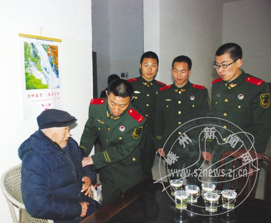 从1990年开始,市消防大队官兵就与童毛士老人结下了不解之缘。逢年过节,官兵们都要“回家”去看看,与老人谈心聊天,帮老人清洗被褥、打扫卫生、烧菜做饭。一批官兵走了,新一批官兵就会立即接过“接力棒”。看望老人已成大队官兵日常生活中不可或缺的“任务”,照顾老人也成了大队官兵的分内事。