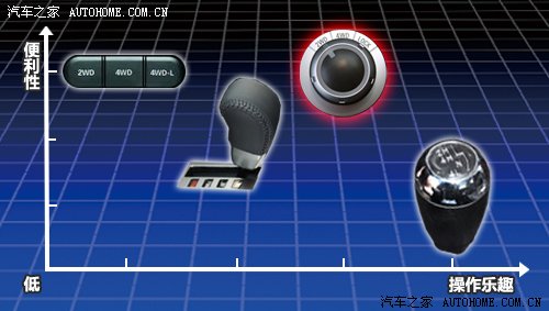 如果你对SUV车型很感兴趣,那对分动箱的两驱、四驱、高速、低速切换功能肯定不会感到陌生(如果你还不了解四驱系统,请单击此链接学习更多知识)。以卫士、牧马人为代表的极少数车型还坚守纯机械手动拨杆分动箱阵地;以帕杰罗、FJ酷路泽为代表的小部分车型使用了电控手柄拨杆;以览胜、大切诺基为代表车众多车型选择了电控旋钮操作模式;以吉姆尼、哈弗为代表的低端车型采用了普通电控按钮。