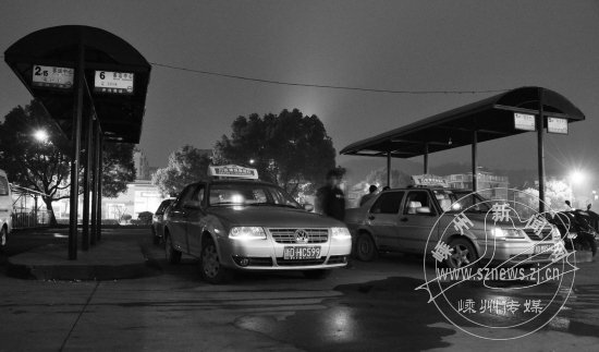晚上,市客运中心公交车停靠站里,最后一班公交车停开后,出租车整齐有序排好队,开始“上岗”等待来客。