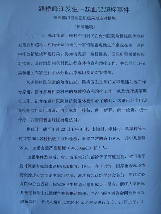 台州上百村民铅中毒 初认电池厂为罪魁祸首