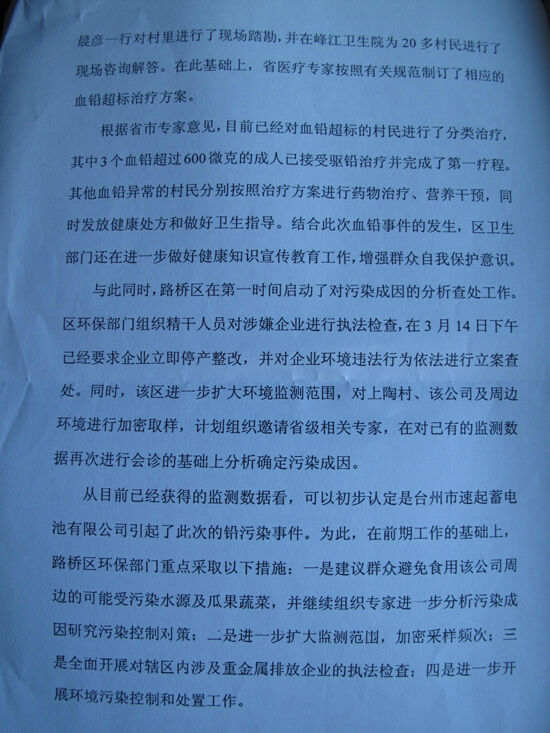 据了解,目前路桥区委、区政府已经对此事采取了积极的应对措施。要求环保部门进行污染分析,邀请专家医生对相关村民进行指导、治疗。并且在台州医院路桥院区体检中心开设免费检查治疗绿色通道,另外还为受影响村民发放了治疗药物。