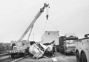 沈峰称,这起事故怪就怪在追尾后,横飞的集装箱“误伤”了旁边行驶的奥龙集装箱货车,“铁柜”压上该车的驾驶室,并撞飞该车上的集装箱。