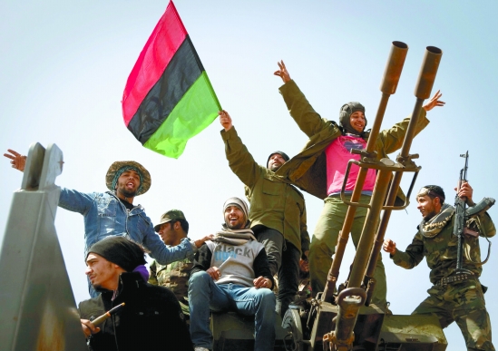 在西方多国联军连续两天的空中打击等全方位支持下,利比亚战事发生逆转,反对派武装连续攻克多座重镇。这是反对派武装在庆祝胜利。人民图片
