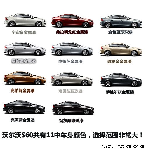 沃尔沃S60提供了高达十一种之多颜色选择,如此丰富的颜色再加上靓丽新颖的外观,驾着它走在路上必定会成为众多路人关注的焦点。由于选择很多,如果有您喜欢的颜色还是要先打电话咨询一下,毕竟4S店里的现车数量是有限的。