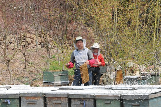 春暖花开,蝶舞蜂忙。油菜花、桃花……各种花儿次第开放,小小蜜蜂采蜜忙,养蜂人也在忙碌中用勤劳和汗水收获他们的“甜蜜事业”。图为金庭镇一家养蜂人戴着面罩正忙着取蜂蜜。