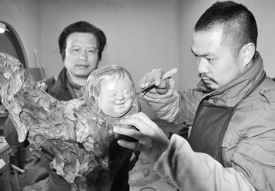 嵊州市艺术村是该市艺术文化的集中研学基地和展示中心,当地一批国家级的艺术大师无私传教,方便了该市艺术人才的学习和成长。图为3月25日,中国工艺美术学会木雕专业委员会副会长、省根艺美术学会主席郑剑夫(左),正现场指导省根艺美术师孙洪锋(右)制作根雕精品。(记者 张亮宗 摄)
