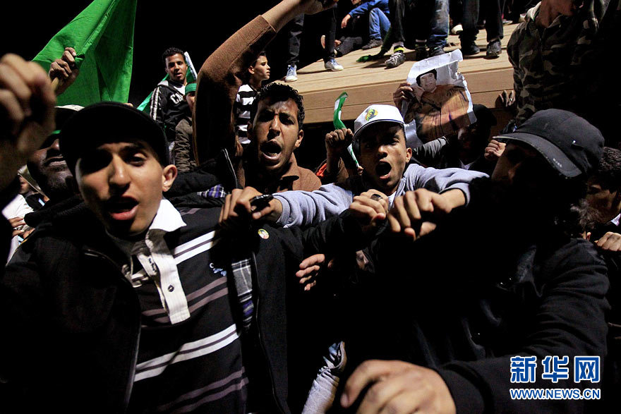 3月31日,在利比亚首都的黎波里,部分民众参加保护利比亚领导人卡扎菲一个住所的“人盾”行动。利比亚国家电视台当日转引利比亚领导人穆阿迈尔·卡扎菲的讲话。卡扎菲说,他“不是该下台的那个人”,相反,那些动用军队空袭杀害利比亚军人的西方国家领导人“该立即下台”。新华社/路透