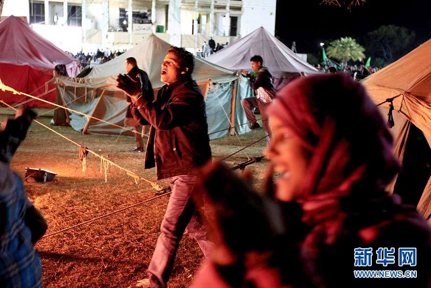 3月31日,在利比亚首都的黎波里,部分民众在利比亚领导人卡扎菲一个住所周围搭建帐篷,目的是保卫卡扎菲。利比亚国家电视台当日转引利比亚领导人穆阿迈尔·卡扎菲的讲话。卡扎菲说,他“不是该下台的那个人”,相反,那些动用军队空袭杀害利比亚军人的西方国家领导人“该立即下台”。新华社/路透