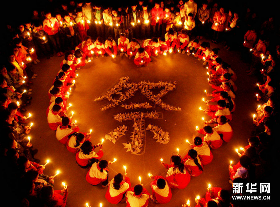 2011年3月31日晚,地处偏远山区的江西德兴市界田中心小学寄宿学校的留守儿童在烛光中将自己折叠的500多只纸鹤摆放成“祭”的字样,缅怀革命先烈。新华社发