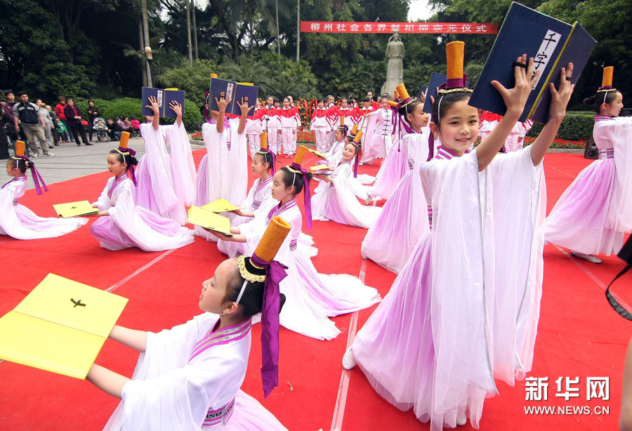 2011年4月1日,在广西柳州柳侯公园,小学生身着传统服饰诵读柳宗元诗文。当日,广西柳州市数百名社会各界人士在柳侯公园祭祀唐代著名散文家柳宗元。公元815年,柳宗元主政柳州,重修文庙,启文教,兴儒学,开民智。新华社发