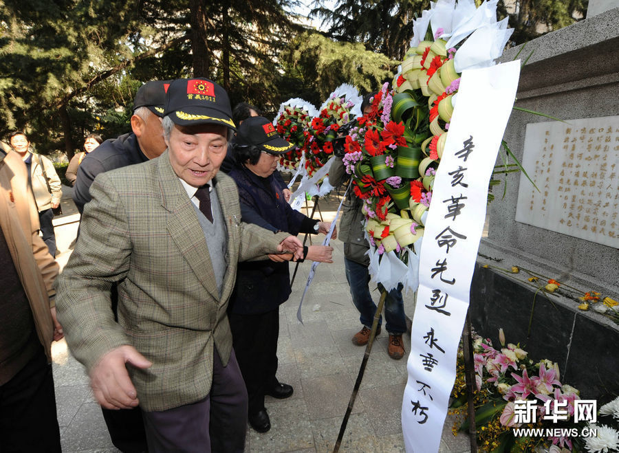 2011年3月29日,辛亥首义志士熊秉坤之子熊辉老人(前中)和辛亥首义志士后裔们一同祭奠先烈。、当日,60位辛亥首义志士后裔聚集在位于武汉市汉口球场街的辛亥首义烈士陵园,祭扫献花,缅怀先烈。新华社发