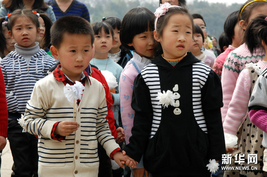 2011年4月1日,浙江省杭州市各中小学和幼儿园纷纷组织学生到杭州市云居山革命烈士陵园缅怀先烈。图为,杭州清波幼儿园的小朋友准备向烈士墓献花。新华社发