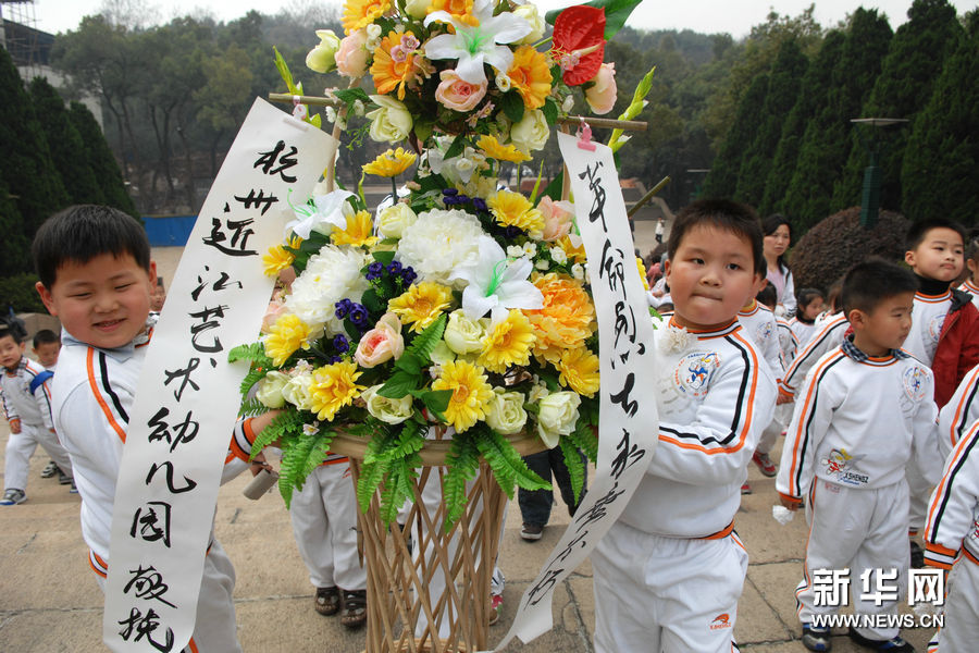 2011年4月1日,浙江省杭州市各中小学和幼儿园纷纷组织学生到杭州市云居山革命烈士陵园缅怀先烈。图为,杭州近江艺术幼儿园的小朋友准备向烈士墓敬献花篮。新华社发