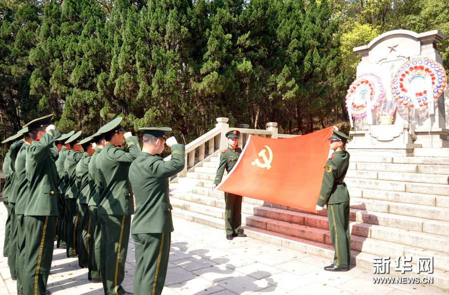 2011年4月1日,武警江西边防总队新兵向烈士敬献花圈,在烈士墓碑前宣读军人誓词,祭奠革命先烈。图为,在方志敏烈士墓碑前宣读军人誓词。新华社发