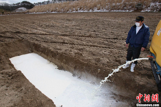 3月23日,日本福岛县Iitate,一位农民将牛奶倒入土坑中。福岛县周边地区原奶和蔬菜等农畜产品的受辐射污染范围23日呈扩大态势,首相菅直人当天首次要求人们不要食用福岛县生产的一些种类的农产品。