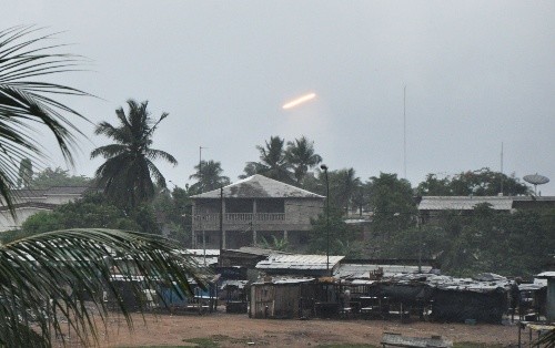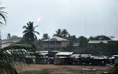 | 4月4日联科团采取军事行动解除巴博部队的重型武器。这是4月4日在科特迪瓦经济首都阿比让拍摄的炮火。 |