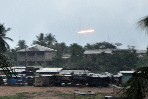 | 4月4日,在科特迪瓦经济首都阿比让,火箭弹划过天空。新华社发(吴小明摄) |
