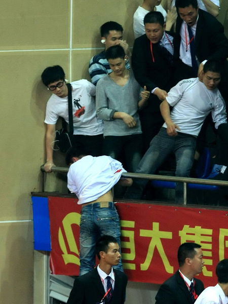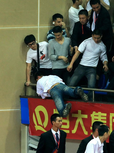 等到第一局18:8时,现场彻底陷入混乱——西看台角落的天津球迷和广州球迷,终于开始了拳打脚踢,而持续了至少2分钟的群架,也让比赛一度中断,两名天津球迷更是在混乱中失足掉下看台。甚至有镲和鼓落到场地内,天津女排的替补队员也由此被波及,队员上前欲制止冲突,但无奈现在观众情绪失控严重,双方球迷逐渐演变成群殴。