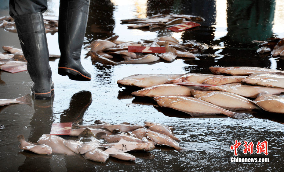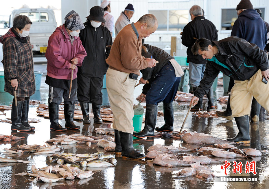 2011年4月5日,日本茨城县,工作人员在鱼市场检查新捕获的海鱼。日本厚生劳动省4日宣布,茨城县北茨城市平舄渔协从捕获的玉筋鱼中检测出每千克4080贝克的人工放射性碘-131。该省已要求茨城县慎重处理玉筋鱼,且将尽速检讨制定安全标准。据悉,这些玉筋鱼是小型拖网渔船1日在北茨城市外海的水深11米处捕获的。这是首次从鱼类体内检测出放射性物质超标。