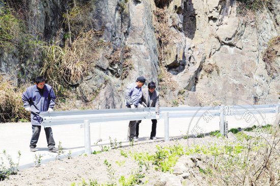 自2008年起,我市每年把农村公路安全保障工程(临水临崖)列为市重点工程。我市2010年度农村公路安全保障工程总投资2538万元,在禹(溪)广(利)线、丰(田岭)竹(溪)线、长(乐)南(库)线等30条农村公路中分别安装钢质波形梁护栏121.59公里。图为近日工作人员正在马村至栈尖坞公路旁安装钢质波形梁护栏。
