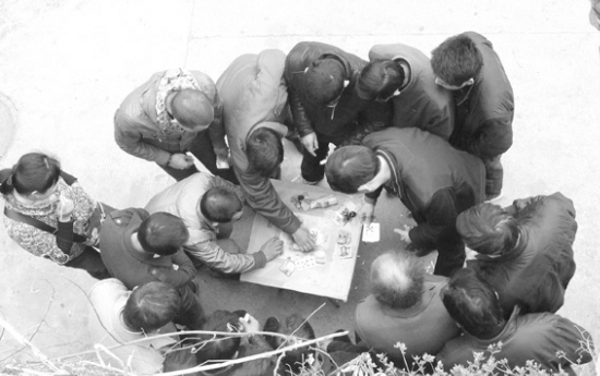 日前,记者在途经新华书店门口时看到,古城墙下有一个露天赌摊,15个人围在赌摊边“激战正酣”,桌子上堆满了扑克牌和人民币。