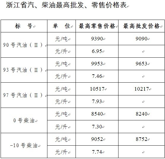 浙江在线杭州4月6日讯(记者 李利) 今天,浙江省物价局下发关于提高成品油价格的通知。自2011年4月7日零时起,全省汽、柴油(标准品)最高零售价格每吨分别提高500元和400元,非标准品汽、柴油最高零售价格按国家规定的品质比率也相应调整。其中,93号汽油最高零售价格从7.06元/升调整为7.46元/升。