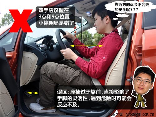 『请注意上图中手握方向盘是不正确的,应该握住方向盘的3、9点位置』