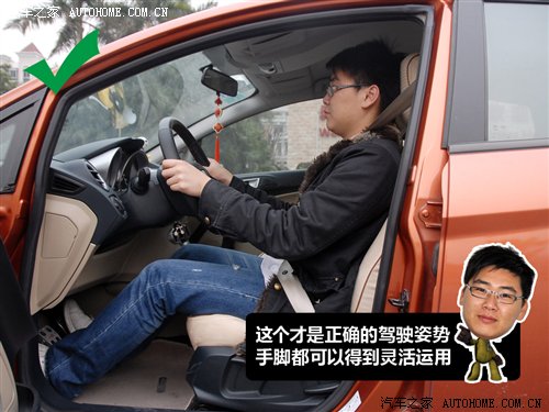 正确的驾驶坐姿应该是:在坐进驾驶席之后,应深深地坐在座椅后部,腰部和肩部靠在椅背,手臂伸向前方,可以自然握住转向盘前段。同时,手腕能自由地弯曲,活动自由;右脚轻放刹车踏板,大小腿间角度应为钝角约120度左右或更大一些,但紧踩时大小腿不能完全呈直线,用脚踩离合器踏板、制动踏板或油门时不费力,身体不能前倾。