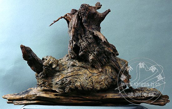 令人关注的是这件作品是用古沉木创制的,古沉木是数千年前深埋在水底泥沙中的枯木残根,随着年代的久远,在水底泥沙中浸泡和磨压下,形成了古朴凝重、铜打铁铸般的效果,显示出峥嵘不桀的力度。出土时的色泽亦各不相同,有棕色、灰色、紫色、黑色,也有外红内黑或是黑皮黄心的。更令人称道的是它们不变形、分量重、密度强,好的古沉木,可与紫檀木媲美,真是奇谲而神妙。仙人、童子、老龟和古沉木的有机结合,为这件作品增添了几分神秘,几分玄机。