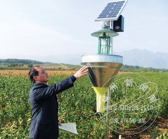 在国家级标准茶园创建园——黄泽明山茶场,安装了45盏生态型太阳能杀虫灯(如图)。据介绍,这些杀虫灯通过太阳能电池板将太阳光直接转换成电能,夜晚害虫会被杀虫灯的特制诱光所吸引,碰及光源的外围电网后触电身亡,从而达到良好的杀虫效果,促进了茶场的无公害生产。