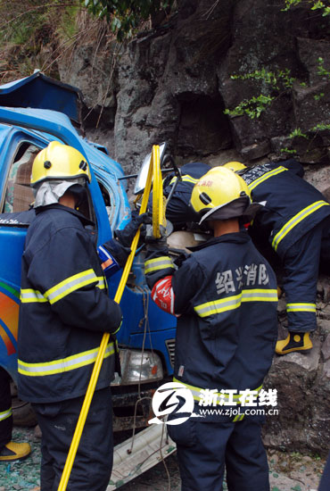 当天上午8时18分,嵊州市消防大队值班室接警后,立即出动警力火速赶赴事故现场。消防队员到场后,只见一辆拖拉机左侧紧贴在山壁的岩石上,车头严重变形,挡风玻璃全部碎裂,运载的玻璃碎片散落在路面上,司机受伤被夹在山壁岩石和拖拉机之间。此时,消防队员发现山壁上一块岩石因撞击产生裂缝,随时威胁到处在“夹缝”中的司机生命安全。