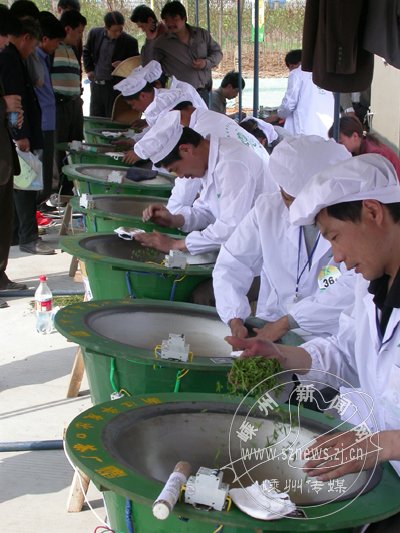 昨日上午9点半比赛正式开始。记者看到,选手们娴熟地抓起一把青叶,均匀地撒入已经预热好的茶机中,不出10分钟,茶香就开始在比赛现场弥漫。