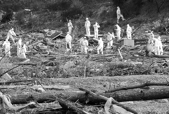 日本警方人员身着防护服在福岛核电站20公里区域内搜寻遇难者。