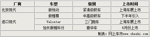 4月8日,北京现代旗下新款中高级轿车——第八代索纳塔正式上市销售,售价为售价16.69万-24.99万元。而记者从知情人士处了解到:在即将举行的上海车展上,北京现代还将推出改款悦动;而进口现代方面,则将会有新雅尊、Veloster和加长版雅科仕等车型与广大消费者见面。下面就让我们一起来了解一下。