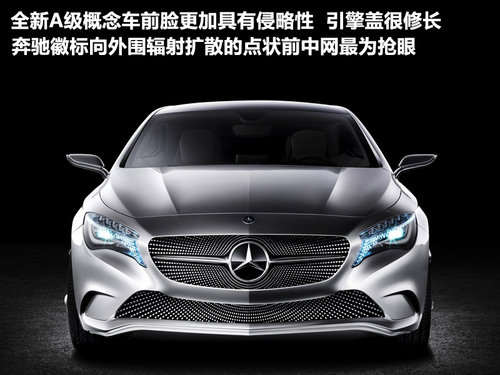 A-CLASS,一款全新的设计诞生,奔驰将这款车定位于与宝马1系列和雷克萨斯CT200H、奥迪A3抢夺市场的主力车型。即将亮相2011年上海国际汽车展,而作为市场购买力最旺盛的紧凑级车型,它给我们带来了绝不止是超前。新A级采用了Benz最新的设计理念,前脸更加具有侵略性,引擎盖很修长,而最突出的莫过于从大型奔驰徽标向外围辐射扩散的点状前中网,它摒弃了传统的条纹状格栅,全新的造型样式让人眼前一亮。
