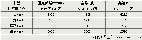 CT200h属于雷克萨斯入门级车型,竞争对手为宝马1系和奥迪A3。从上表我们可以看出,雷克萨斯CT200h车身尺寸与宝马1系和奥迪A3同属一个级别。在轴距方面CT200h达到了2600mm位于两款车型之间。宝马1系和奥迪A3的车型都分别搭载了两款不同发动机,所以售价区间跨度比较大,而雷克萨斯CT200h只配备一款有点混合动力引擎,所以售价与1系和A3高配车型持平,预计售价在35万元左右。
