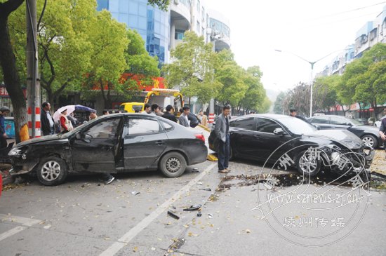 4月15日下午1时多,市区剡城路和越秀北路路口发生两辆轿车相撞事故,堵塞了剡城路自西向东的道路。